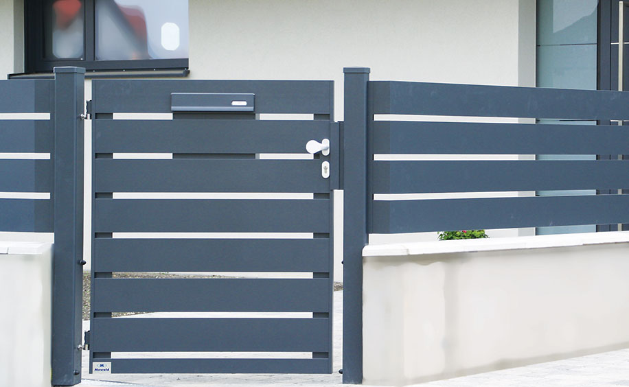 Zweiflügeliges Drehtor und Gehtüre mit waagrechten Z-Lamellen (Bild 22103)